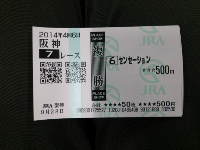 今日は阪神競馬場に行ってきました。天気が良かったこともあり、空の青と芝生の緑がとてもきれいでした。親子連れも結構来てましたね。競馬場では基本的にレースを見るスタンドと、馬の状態をチェックするパドックとをレースごとに行き来することになります。レースを見るだけでも迫力があって楽しいんですが、やっぱり競馬新聞やパドックで馬をチェックして馬券を買ったほうが楽しいですからね。第7Rにセンセーションという馬がいて、これは買わなければと思い買ってみたら3着に入ってくれました。今日の勝ちはこれだけで後のレースは負けました。結果としてはプラスだったんですが、交通費と昼食代でトントンでしたね。走っている馬の迫力を味わえるのは競馬場ならでは。一度行ってみると楽しいと思いますよ。